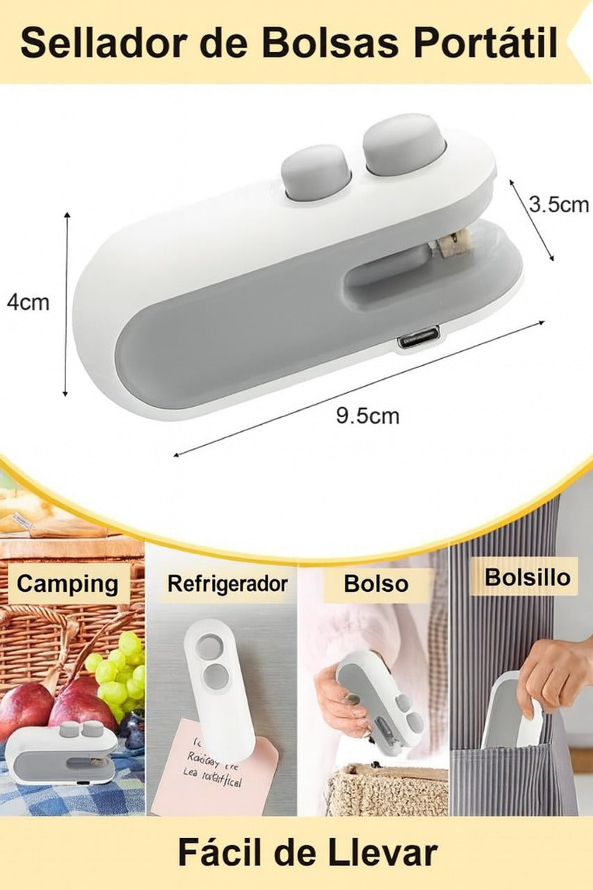 Funciona con carga USB, es compacto, ligero y perfecto para usar en la cocina, oficina o llevar de viaje. Solo deslízalo sobre la bolsa y crea un sellado resistente al aire y la humedad, ideal para snacks, cereales, frutas secas, galletas y más.